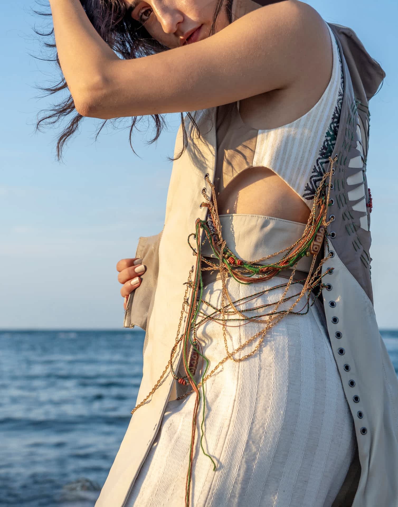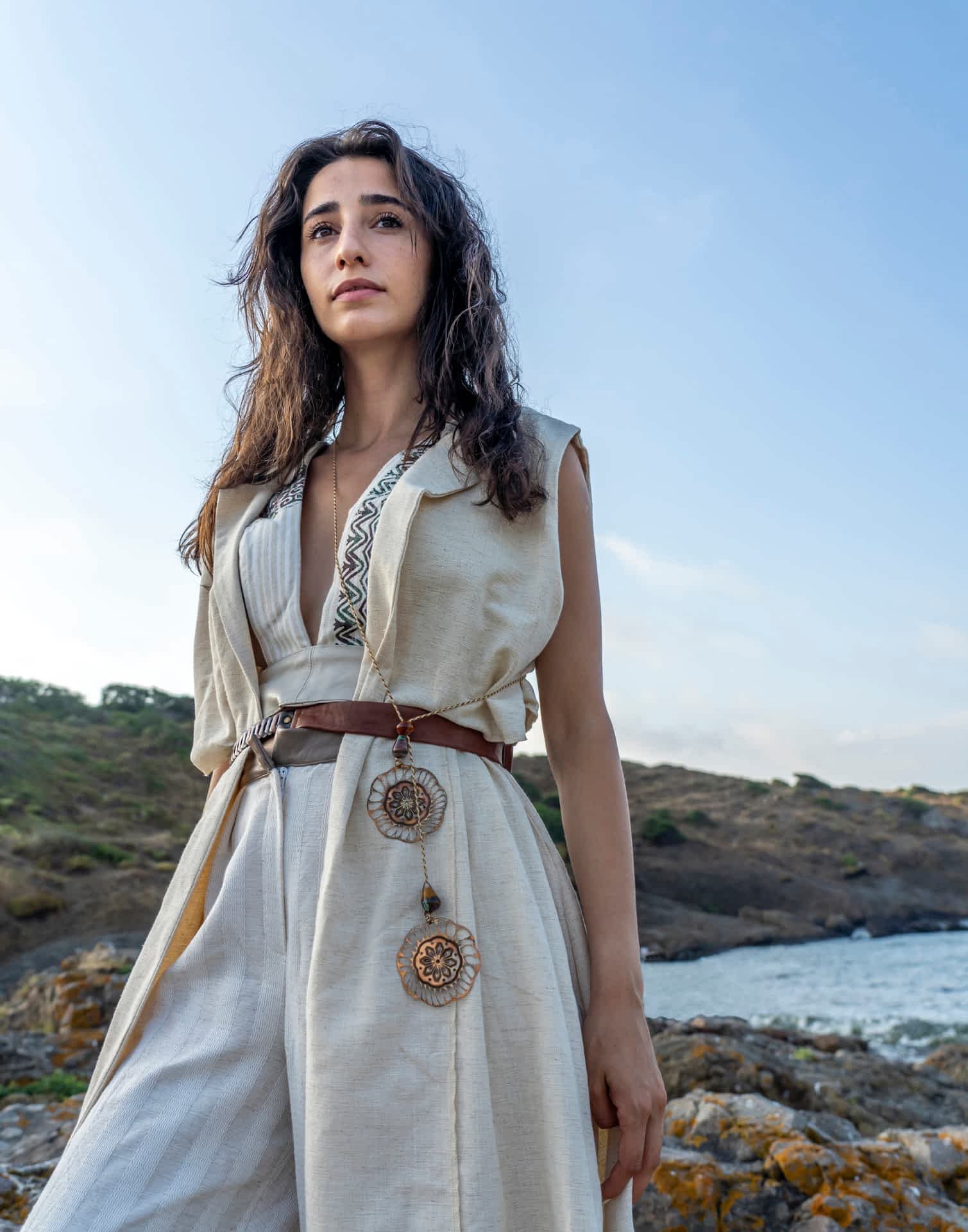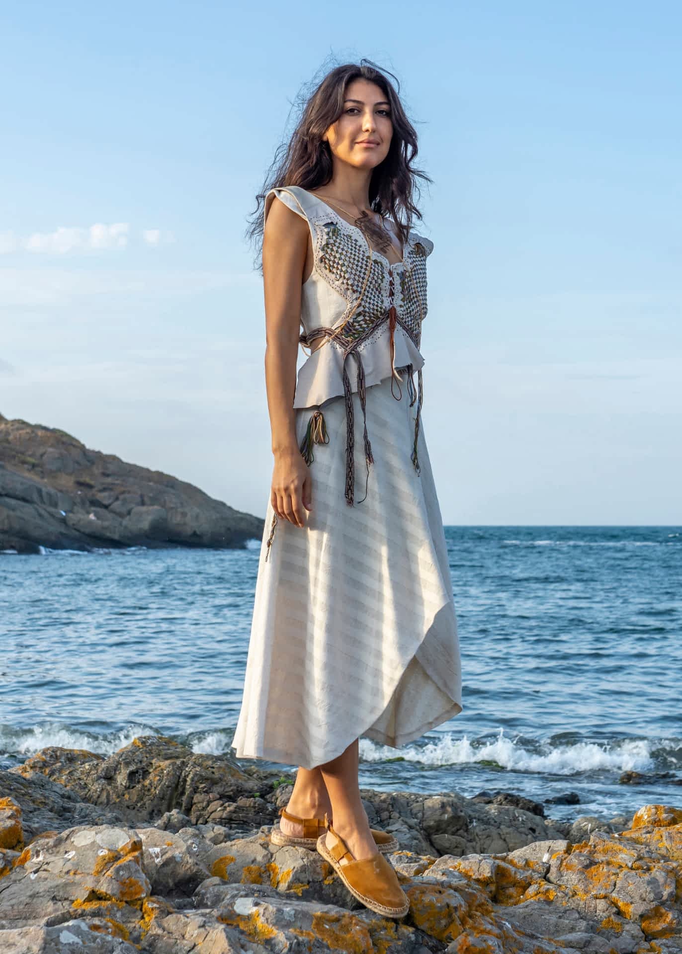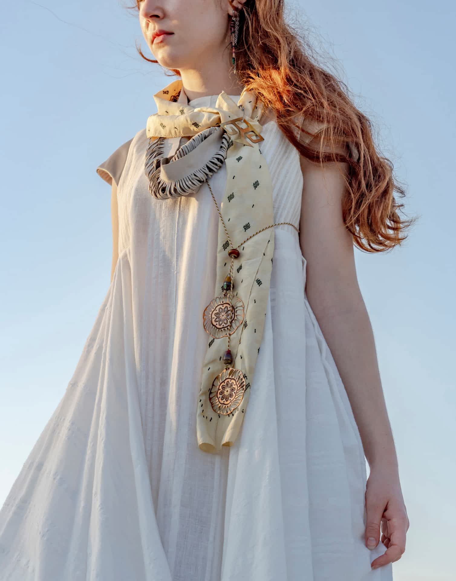 Yarattığım organik formlar, zanaat metodları ile harmanlanırken kullanılan materyaller Hatay’ın eşsiz altın sarısı ipeği, keten dokuması ve atık derilerden oluşmaktadır.